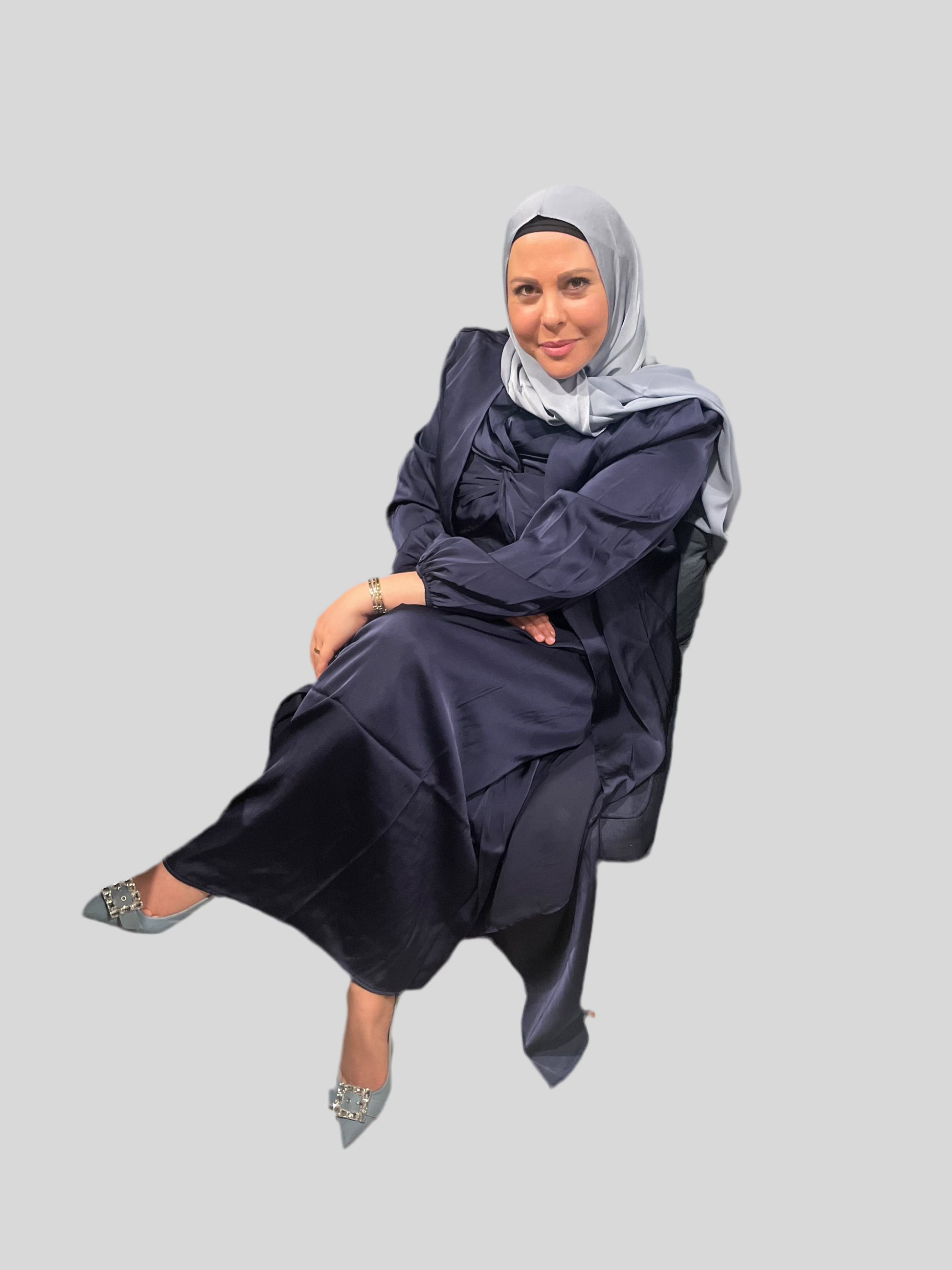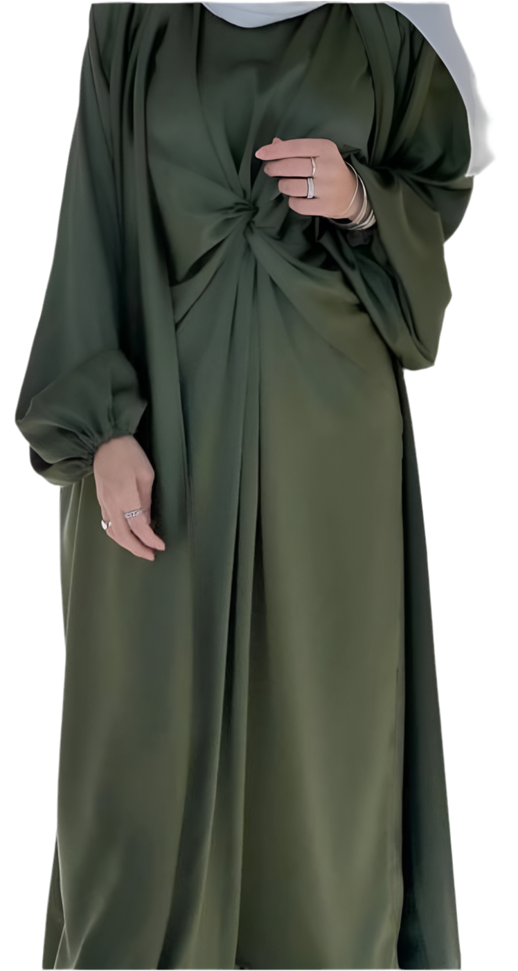 Elegant and sophisticated, this woman's ensemble in multicolors tones consists of Abaya dress, a stylish cardigan and a chic dress. The combination exudes a timeless charm, perfect for both professional settings and refined casual occasions