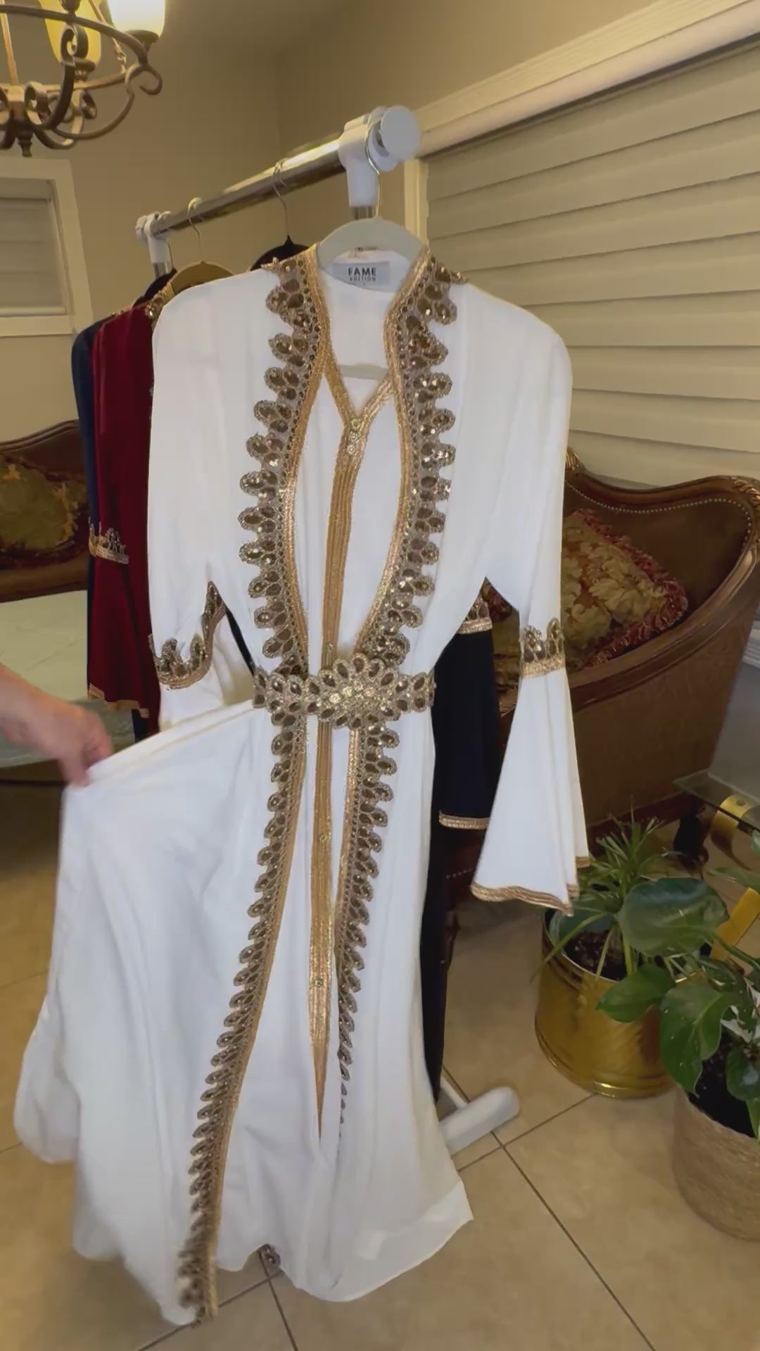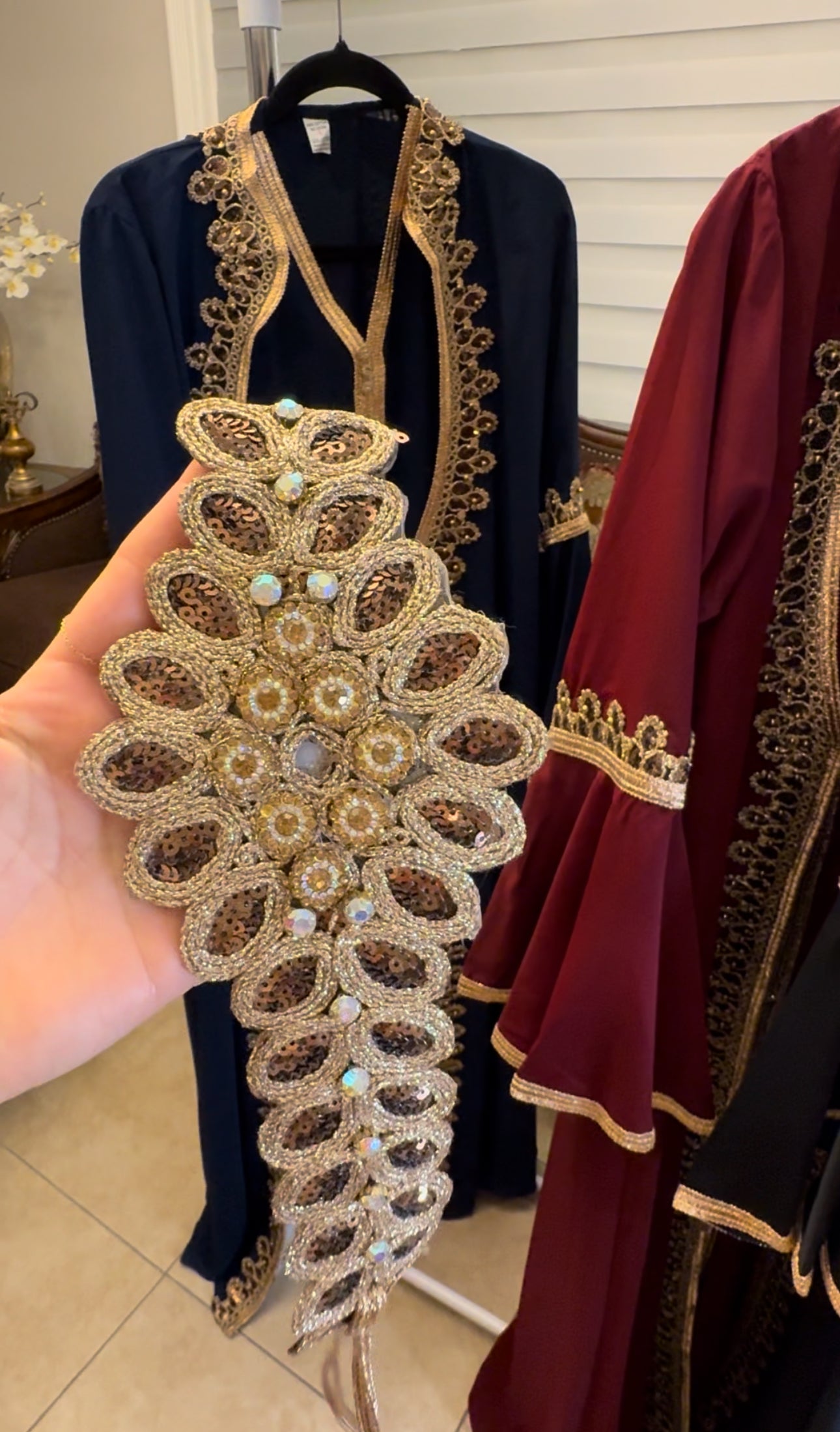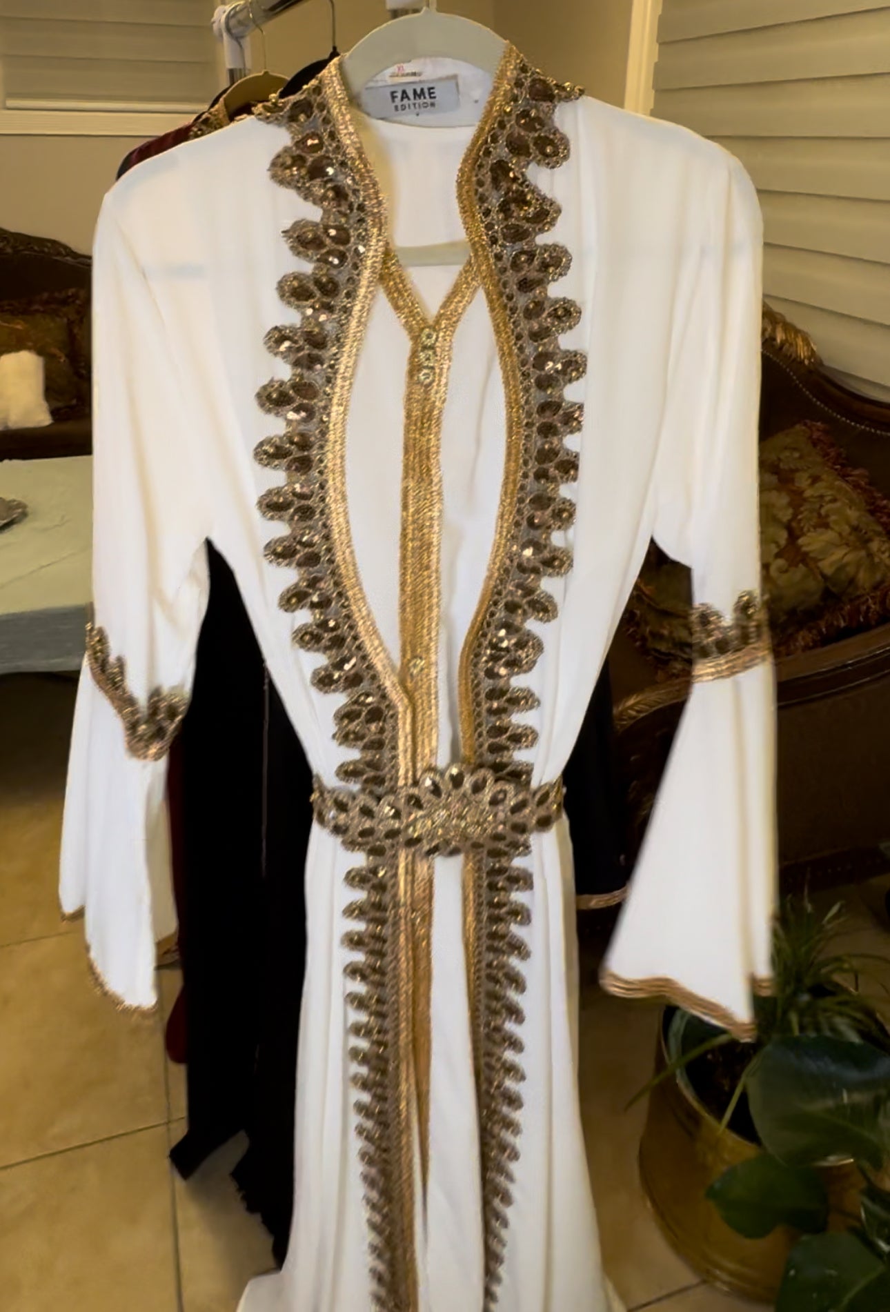 Long sleeve Kuftan with unattached under dress and gemstones belt.