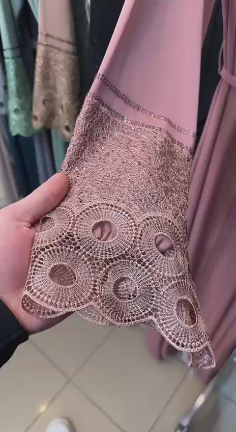 Very elegant georgette abaya with lace sleeves and rhinestones.
